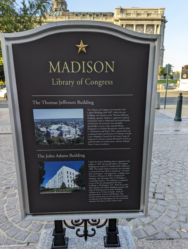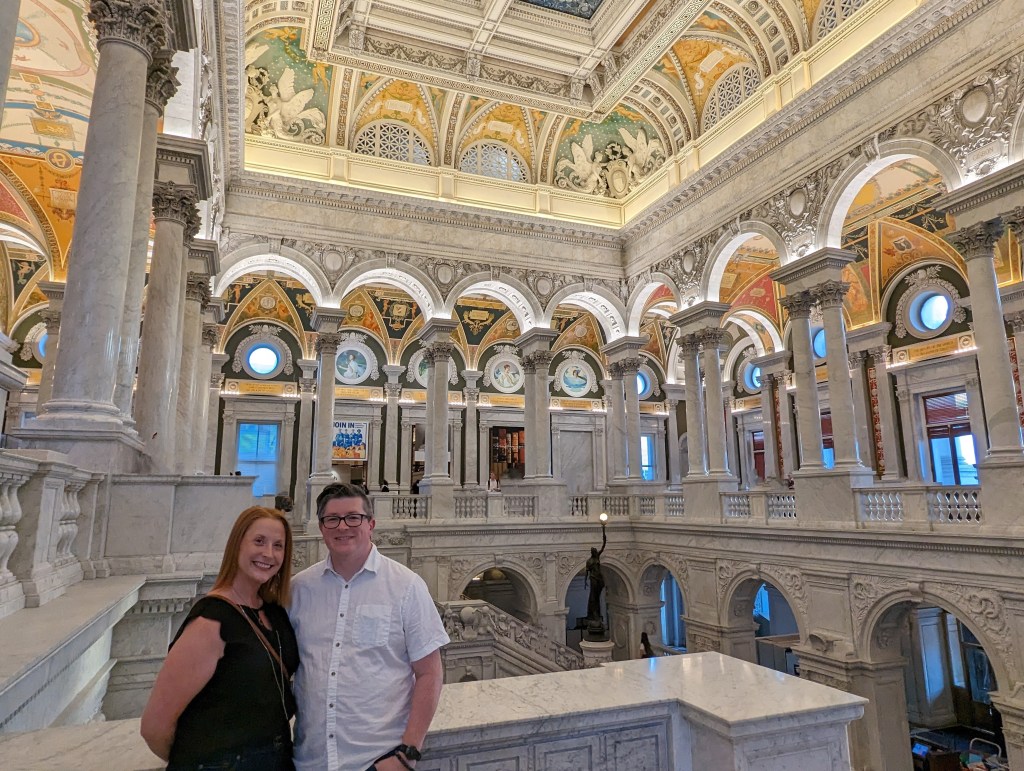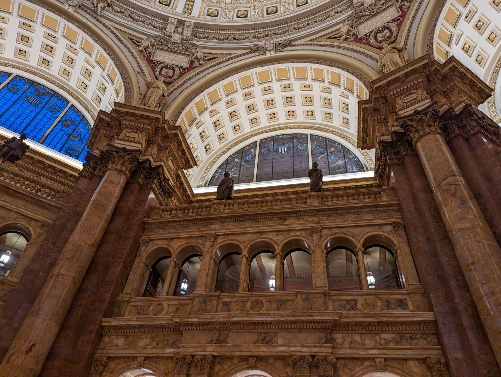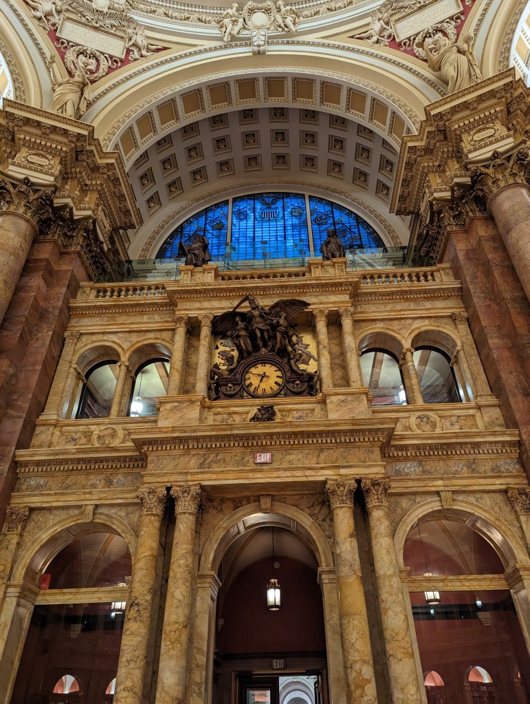 I’m a library nerd, so the one thing I knew I definitely wanted to try to do while we were in DC was visit the Library of Congress. And it turns out that they host a happy hour every Thursday evening! It also turns out that this happy hour is quite popular—the line for drinks was quite long. (Full disclosure: I used my phone’s “magic eraser” function to remove bystanders from a couple of the photos above.) A lot of people, in fact, were getting drinks and then immediately getting back in line for their next one. We just went through once, and then took the opportunity to wander around and see the place, which is stunning. Being in the main reading room was something I’ll never forget.